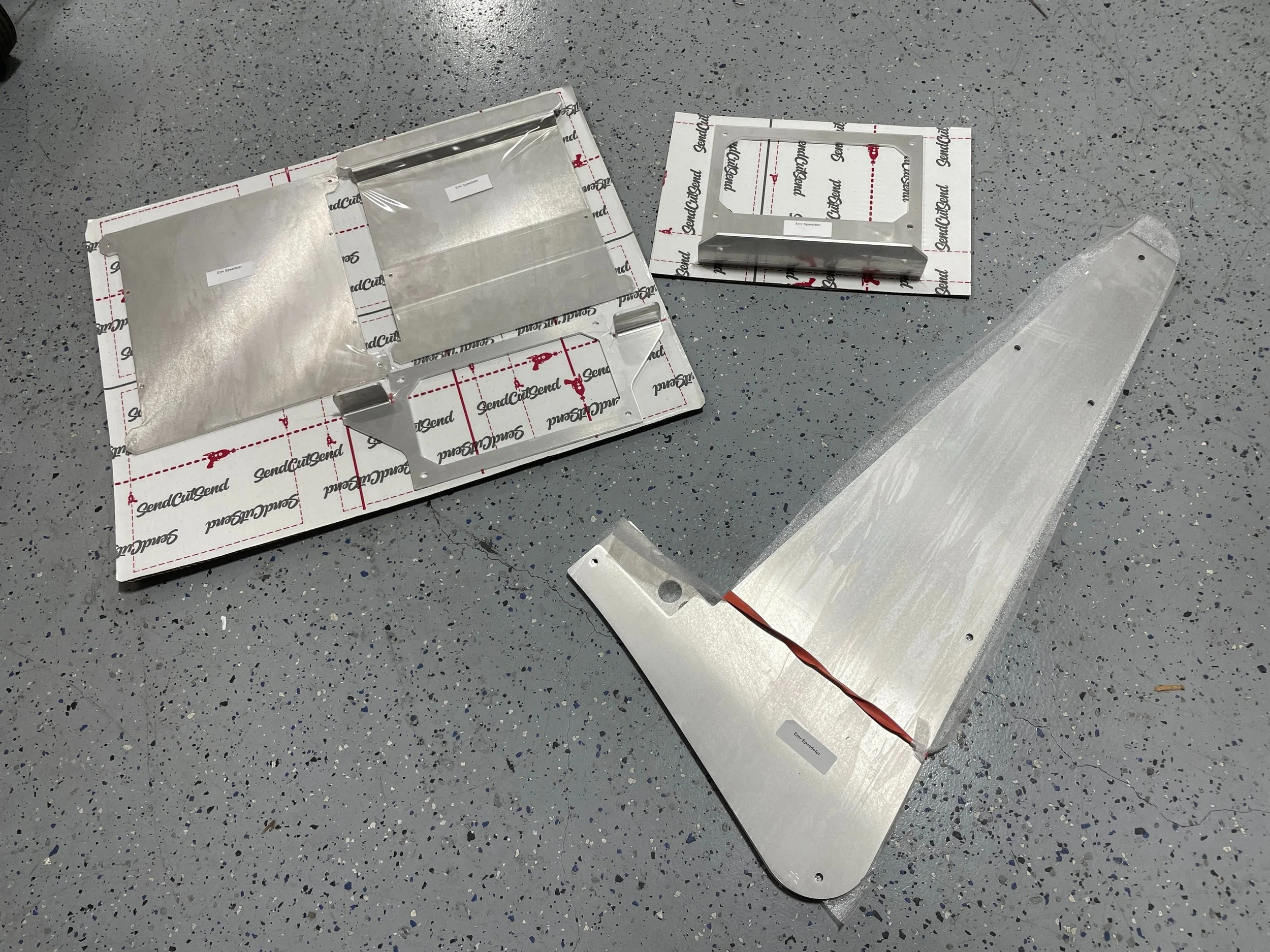 The hard parts of the Speedster have started to arrive in preparation for the conversion. These are all part of the front trunk, or frunk. It’s a bit abstract in this form, but these are the battery keepers, frunk plates, and frunk lids.