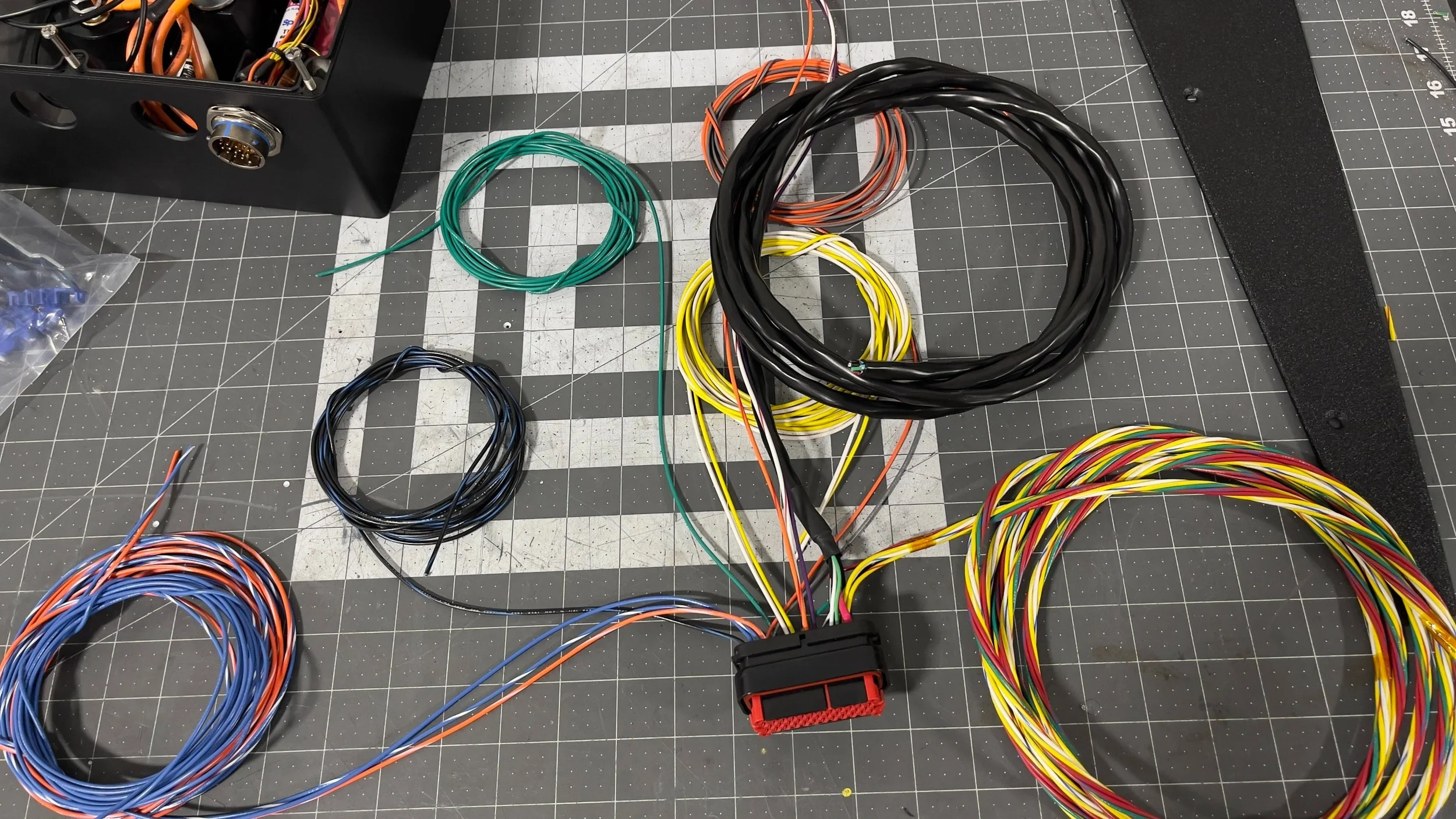 This week we also started laying out the Vehicle Control Harness, separating each bundle of wires out so they can be run to their final destinations. Some go to the throttle, some to the dashboard for direction control, and others to the contactor box to control current flow, etc. These will then be cut to length, pinned to their corresponding connector, and loomed and routed through the car.